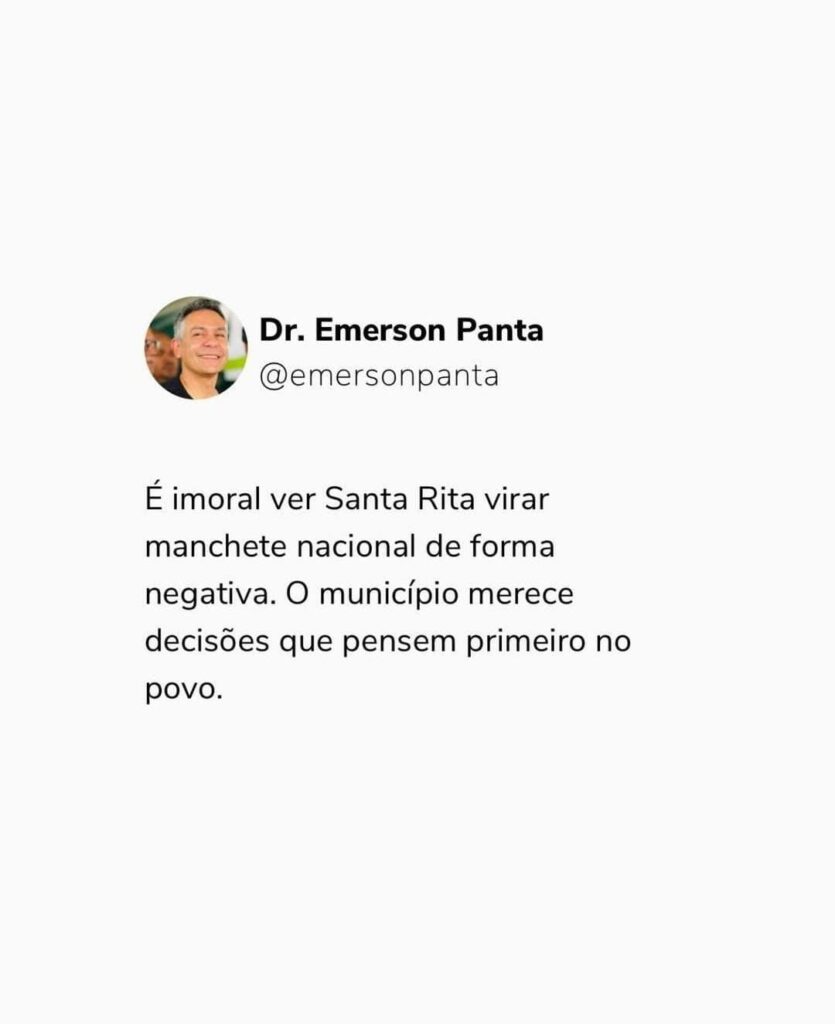 Mesmo encontrando-se inelegível, o ex-prefeito de Santa Rita, Emerson Panta, usou suas redes sociais para fazer duras críticas à Câmara Municipal após a aprovação de uma resolução considerada polêmica e moralmente indefensável por grande parte da população.